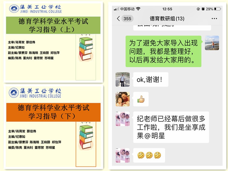 突如其来的疫情,使得德育教研组备战学考计划受阻。但是,“老纪”“越是艰险越向前”。在这场战“疫”初始,根据学校《关于新型冠状病毒感染的肺炎疫情防控工作通告》精神,她 1月30日就与新任德育组长蔡素芬老师共同策划“疫情防控时期德育组课程教学及学业水平测试实施方案”,就疫情防控时期及学期德育课程教学特别是德育学业水平考试制定详细有效的应对措施。为了德育组教师更好实施“停课不停教、停课不停学”的线上教学活动,备考德育学科学业水平考试,她在2月12日线上教学开学之前,编辑了十八万多字的《德育学业水平考试指导书》,整理多份课程资料。德育组长蔡素芬老师说:“纪老师幕后做很多工作,我们是坐享其成。”