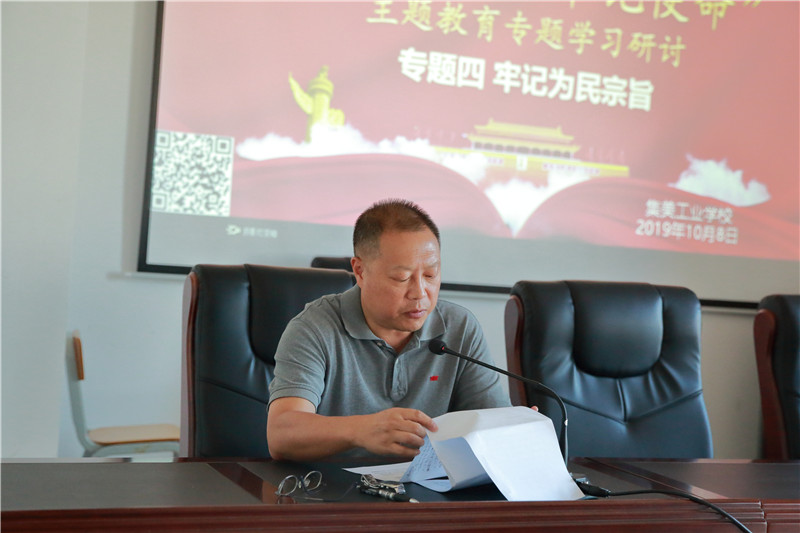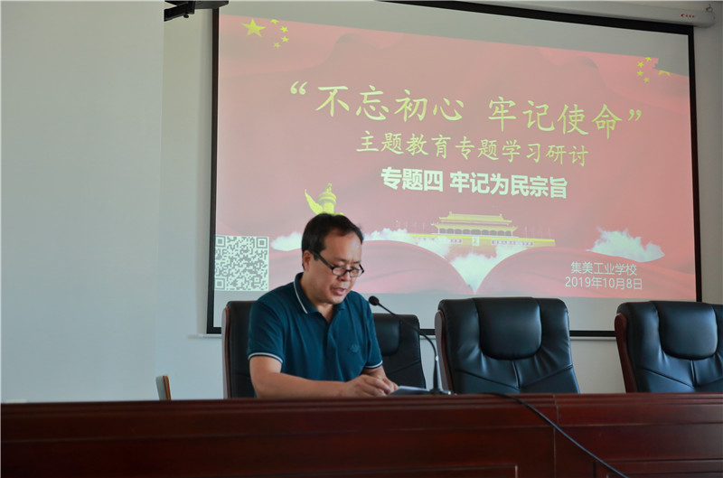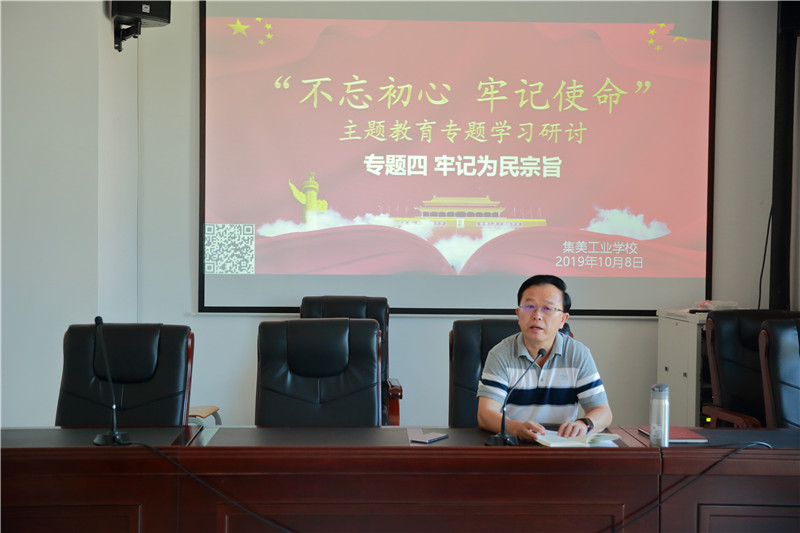 校党委书记陶顺生发言的主题是“牢记宗旨,不负使命,办人民满意的职业教育”。他说,通过学习深刻认识到了坚持以人民为中心的重要性和必要性;深刻理解了坚持以人民为中心的基本要求;找准了办人民满意的职业教育的着力点,今后要更加紧密地联系工作实际和思想实际,以高度的政治责任感,牢记宗旨,不负使命,办人民满意的职业教育。他分别从对宗旨内涵的认识和学习习近平总书记的为民情怀,谈如何牢记宗旨,不负使命,办人民满意的职业教育。他指出,学校如何贯彻以人民为中心的思想?就是要坚持立德树人的办学宗旨,把“以学生为中心”,作为学校工作的出发点和落脚点,培养出更多更好的中国特色社会主义的建设者和接班人。以学生为中心,就是以学生利益为重、以学生评价为主。在老师的眼中,所有的学生都是可塑之才;有问题的学生,都是上帝啃过的苹果。他强调,教育的本质,就是发展人、引导人。以人为本,以人为中心。学生是教育的中心,也是教育的归宿。以学生为中心,就是要不断提高教育质量。