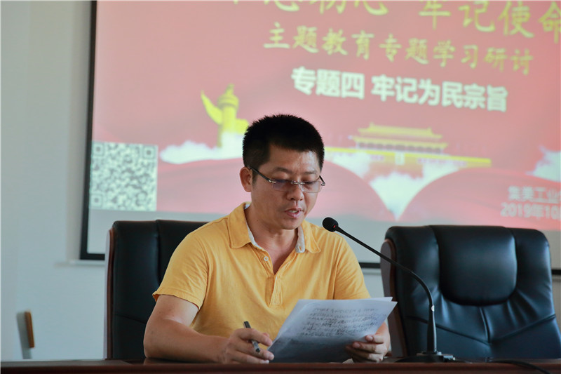 行政第三支部书记陈育辉发言的主题是“牢记为民宗旨,为学生服务,为德育团队服务,为学校服务”。他主要从“牢记宗旨意识;牢记服务宗旨,为德育团队服务;牢记大局意识,服务学校”三方面进行阐述。他说,每一名共产党员都应该时刻牢记全心全意为人民服务的宗旨,把践行党的宗旨同自己的工作和言行紧密联系起来,把践行党的宗旨同自己的工作和言行紧密联系起来,一切从人民的利益出发,求真务实,扎实工作,有了全心全意为学生服务,为德育团队服务,为学校大局服务的意识和宗旨,我们的工作就不会迷失方向。